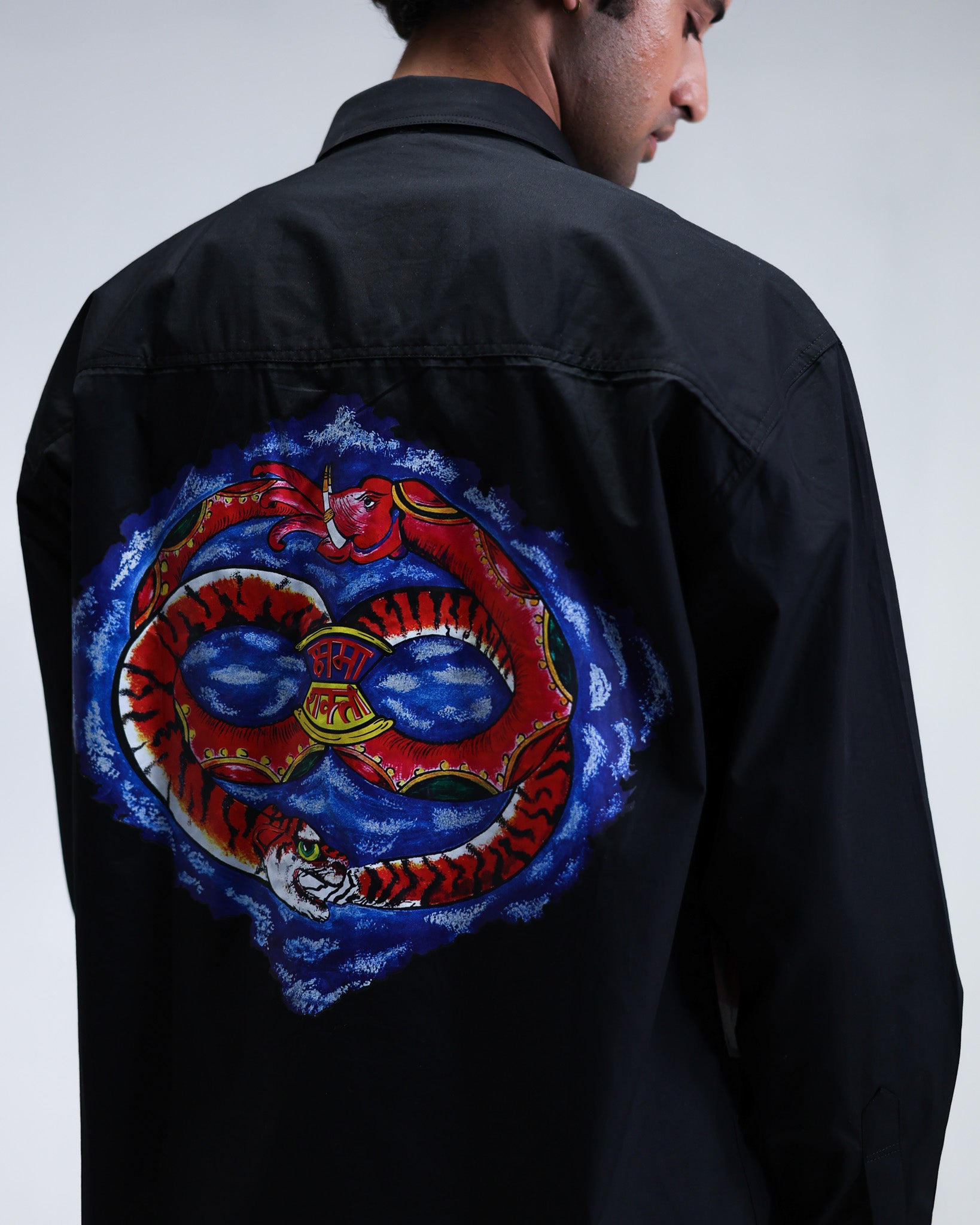 Crafted in black cotton poplin, this relaxed shirt carries the weight of an eternal dilemma. An ouroboros artwork twists two beings into one — the tiger, fierce and unyielding, and Airavata, calm and enduring — each devouring its own tail. The design reveals a truth: every act of shakti is bound in the loop of kshama, and neither survives without the other. A silhouette built for ease, with prints that embody the eternal struggle between strength and restraint. The Bhujang Shirt is not just worn — it is a reminder that power and forgiveness are forever entwined.